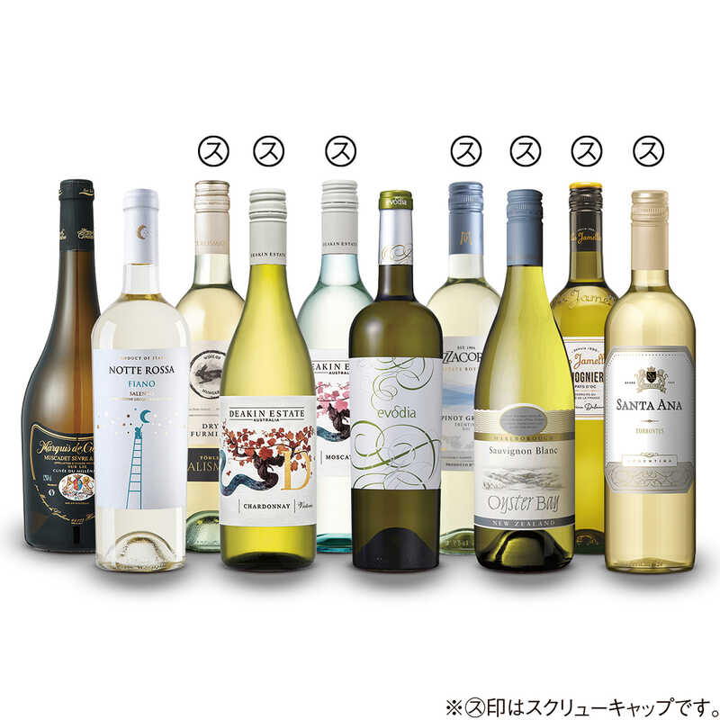 - グーレーヌ(フランス/ミュスカデ)・レジャメル(フランス/ヴィオニエ)・メッツァコロナ(イタリア/ピノグリージョ)・ノッテロッサ(イタリア/フィアーノ)・エヴォディア(スペイン/マカベオ)・タリスマン(ハンガリー/フルミント)・オイスターベイ(ニュージーランド/ソーヴィニヨンブラン)・ディーキンエステート(オーストラリア/シャルドネ)・サンタアナ(アルゼンチン/トロンテス)(各辛口)・ディーキンエステート(オーストラリア/モスカート)(甘口)×各1(各750mL)