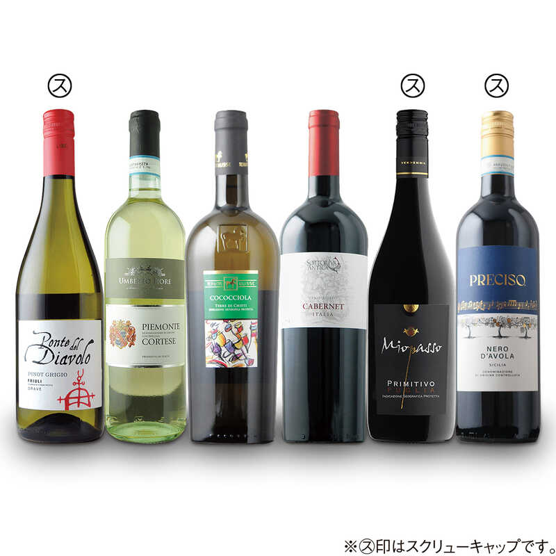 - ピノ グリージョ ポンテ デル ディアボロ 白(辛口)(イタリア/フリウリ ヴェネツィア ジュリア)・ピエモンテ コルテーゼ DOC 白(辛口)(イタリア/ピエモンテ)・ココッチオーラ 白(辛口)(イタリア/アブルッツオ)・ソットリーヴァ アンティカ カベルネ 赤(ミディアムボディ)(イタリア/ヴェネト)・ミオパッソ プリミティーヴォ 赤(フルボディ)(イタリア/プーリア)・プレシーソ ネロ ダヴォラ 赤(フルボディ)(イタリア/シチリア)×各1(各750mL)