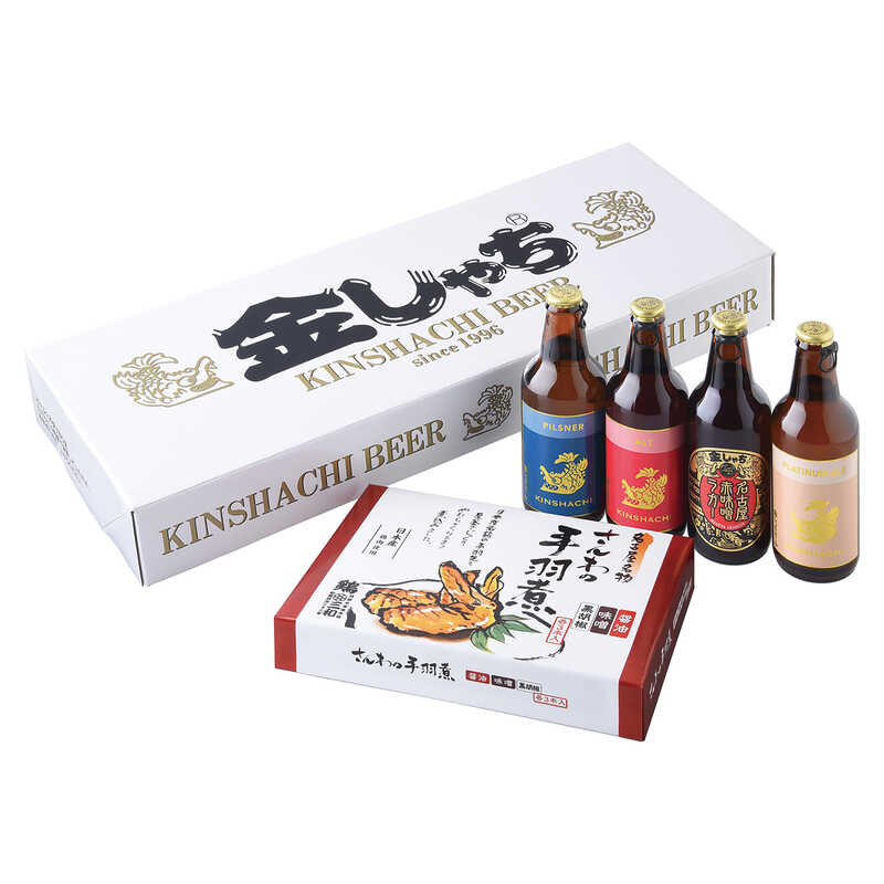 - 金しゃちビール/ピルスナー・アルト・プラチナエール・名古屋赤味噌ラガー(各330mL)×各1、さんわの手羽煮3種アソートセット(醤油・味噌・黒胡椒×各3)×1