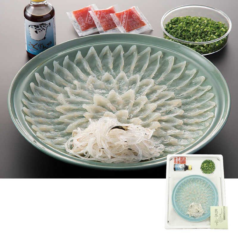 - 刺身(菊盛り)(120g)(皮刺しを含む)(青磁皿盛り)、きざみ小ねぎ(10g)、ポン酢(95ml)×1、もみじおろし(5g)×3(トラフグ:国内産、養殖)