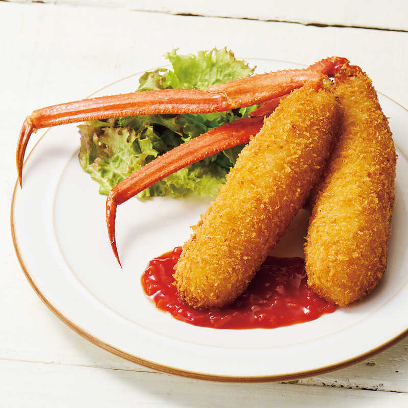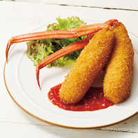 かにエキスで炊き込んだピラフを、紅ズワイガニの脚肉に巻きつけたライスコロッケ。インパクトあふれる一品は、おもてなしにもぴったり。