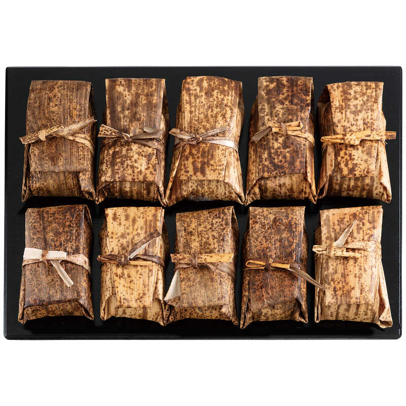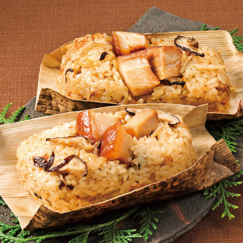 創業130余年の料亭から。豚の角煮を炊き込みご飯にのせ、竹皮で包み蒸しあげた自慢の一品です。