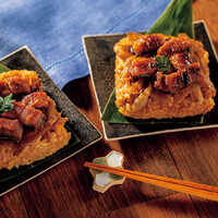 霧島山系の湧水で育てられたうなぎを炭火でじっくりうまみを凝縮させた蒲焼を、たれと炊いたモチモチおこわにのせました。佐賀県産もち米など国産素材にこだわっています。