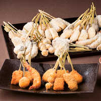 - 串揚げ(踊り海老・白身魚・いか・羽衣チーズ・鳴門金時・射込蓮根×各4串、かき・磯辺餅・道明寺蒸し・銀杏・ゆり根・洋風蒸し・ポークフィレ・鶏むね肉白葱・神戸牛・海老×各2串(計16種44串))、タレ3種