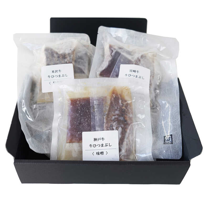 - 神戸牛味噌味・米沢牛昆布味・宮崎牛昆布塩味 各55g、肉ダレ40gx3、〆出汁100gx3