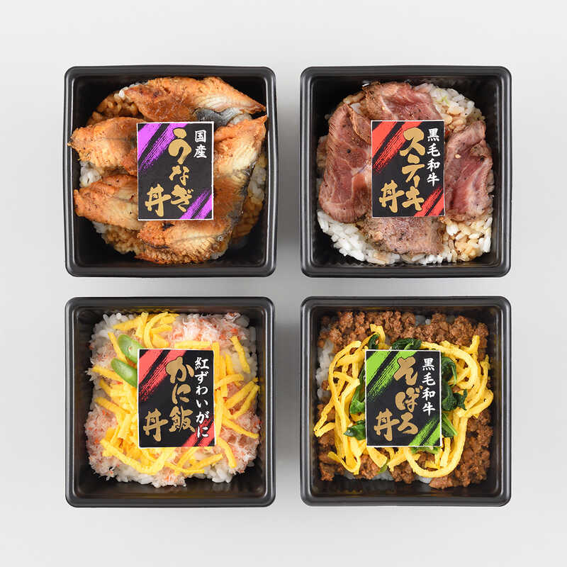 黒毛和牛そぼろ丼135g、黒毛和牛ステーキ丼120g、国産うなぎ丼110g、紅ずわいがにかに飯丼120g
