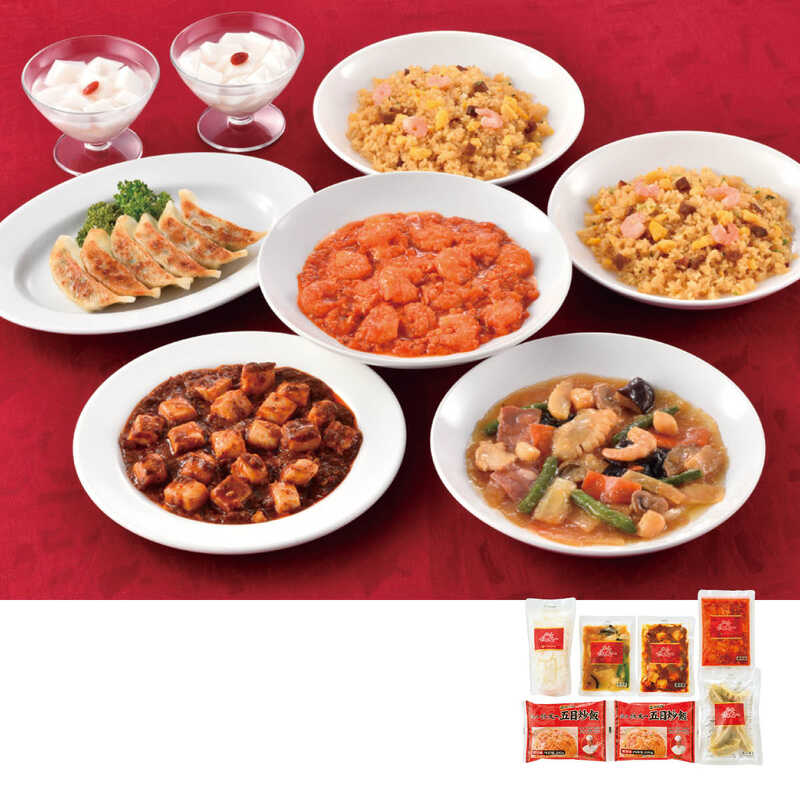餃子(120g)(6個入)、本格四川麻婆豆腐・乾焼蝦仁(エビチリソース)・本格八宝菜(各150g)、ふっくら五目炒飯(200g)×2、杏仁豆腐(500g)