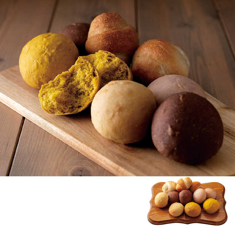 - まるごと豆乳ロールパン×3、かぼちゃパン・オレンジパン・むらさきいもパン・ココアパン×各2