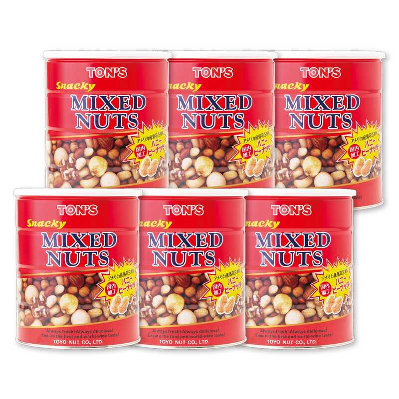 ミックスナッツの定番、人気のハニーピーナッツも入った8種ミックスナッツ缶。6缶入り。*はちみつを使用しております。1歳未満のお子様には与えないでください。
