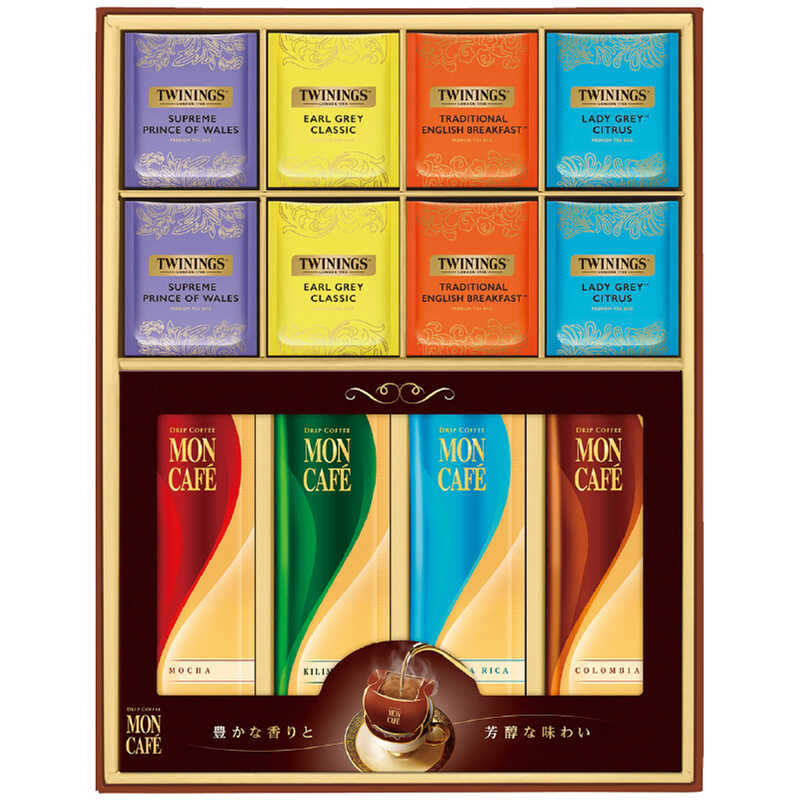モンカフェ ドリップコーヒー/コロンビアブレンド・モカブレンド・キリマンジャロブレンド・コスタリカブレンド×各3、トワイニング/プリンスオブウェールズ・レディグレイ・イングリッシュブレックファスト・アールグレイ×各6