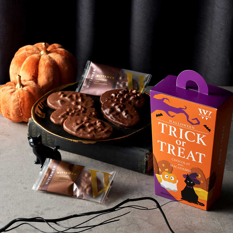 ハロウィン限定パッケージのマカダミア・ショコラ。ミルクとダークの詰め合わせです。
