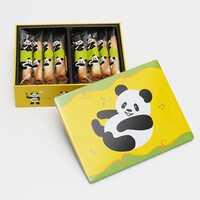 【パンダ プティ シガール】パッケージコンセプトは『パティシエパンダ』。側面には実際にパンダがクッキー作りに奮闘している(?)姿がユーモアたっぷりに描かれています。