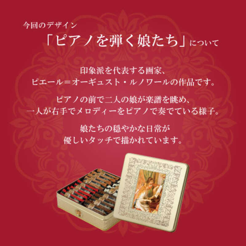レーマンが誇る50年以上のロングセラー商品。チョコレートやチョコレートと生地を組合せたチョコレート菓子4種類のアソートです。ルノワール『ピアノを弾く娘たち(部分)』の期間限定デザインです。ココアサブレ9個、アーモンドサブレ9個、ピアチョコレート10個、チョコレートウエハース9個