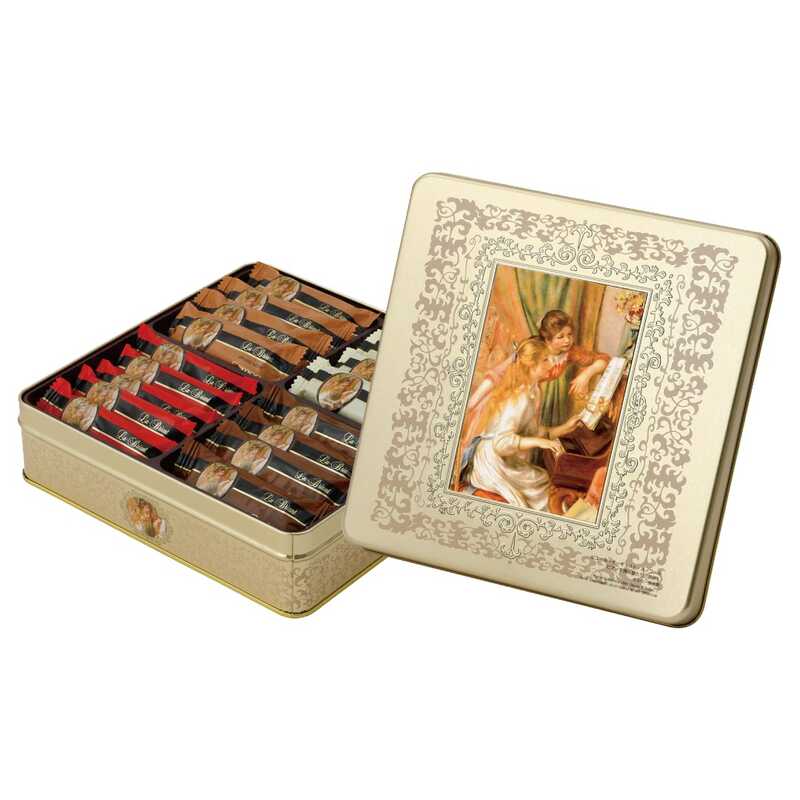 レーマンが誇る50年以上のロングセラー商品。チョコレートやチョコレートと生地を組合せたチョコレート菓子4種類のアソートです。ルノワール『ピアノを弾く娘たち(部分)』の期間限定デザインです。ココアサブレ9個、アーモンドサブレ9個、ピアチョコレート10個、チョコレートウエハース9個