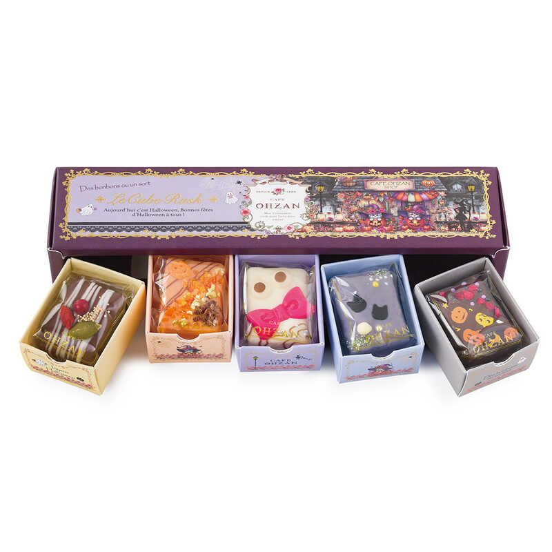 ハロウィン限定のキューブラスクです。サクサクに焼き上げたラスクに、チョコレートをコーティング。ハロウィンをモチーフした限定のトッピングです。今年はカボチャプリンとモンブランミルクのフレーバーが新登場!パッケージには魔法学校を卒業した2匹の猫が始めた雑貨屋さん。正面にペールパープル、サイドはフェミニンな小花柄で大人の雰囲気を出しています。大人可愛いカフェオウザンのハロウィンをお楽しみください。