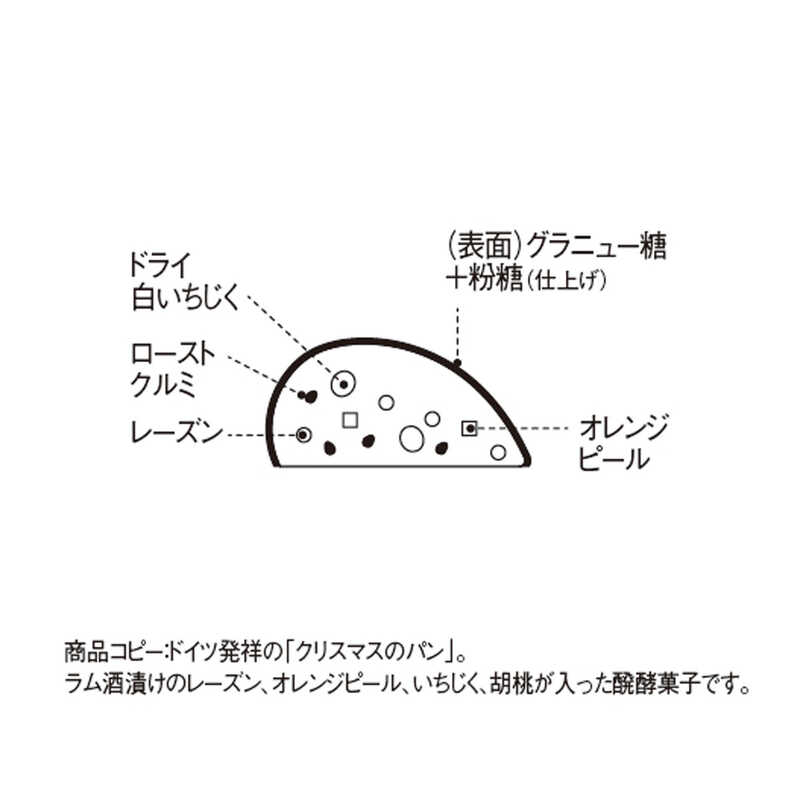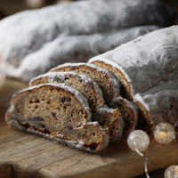 ドイツ発祥の「クリスマスのパン」。ラム酒付けのレーズン、オレンジピール、いちじく、胡桃が入った発酵菓子。