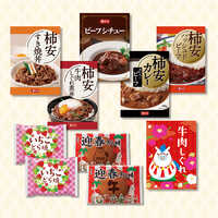 - 牛肉しぐれ(福袋限定)50g、すき焼丼の具120g、牛肉しぐれ煮丼の具115g、ビーフシチュー170g、ビーフカレー190g、ハッシュドビーフ210g、どら焼(プレーン)2個、どら焼(いちご)2個