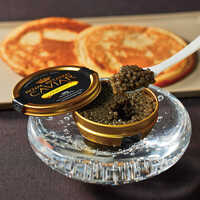 特選ベルギー産キャビア オシェトラを、25g ずつ小容量缶に詰めました。そば粉のパンケーキをひと口大にちぎり、キャビアをたっぷりのせてお召しあがりください。シャンパンとの相性は抜群です。