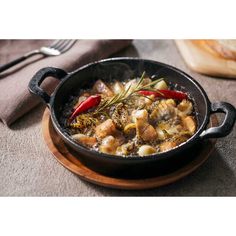 つぶ貝を今風なアヒージョにしてみました。すでに食べやすい大きさにカットし、下味をつけているため食べやすくなっています。お酒のお供はもちろん、アウトドアにもぴったりです。実はアレンジ幅が広いつぶ貝!工夫次第で様々な料理にお使いいただけます。オイルが多めに入っているため、お好きな具材を足していただいても良し、パスタソースとしてや、キャベツと和えてサラダとしても…などなど自分だけのアレンジ方法を楽しめます。つぶ貝の可能性を感じる商品です!
