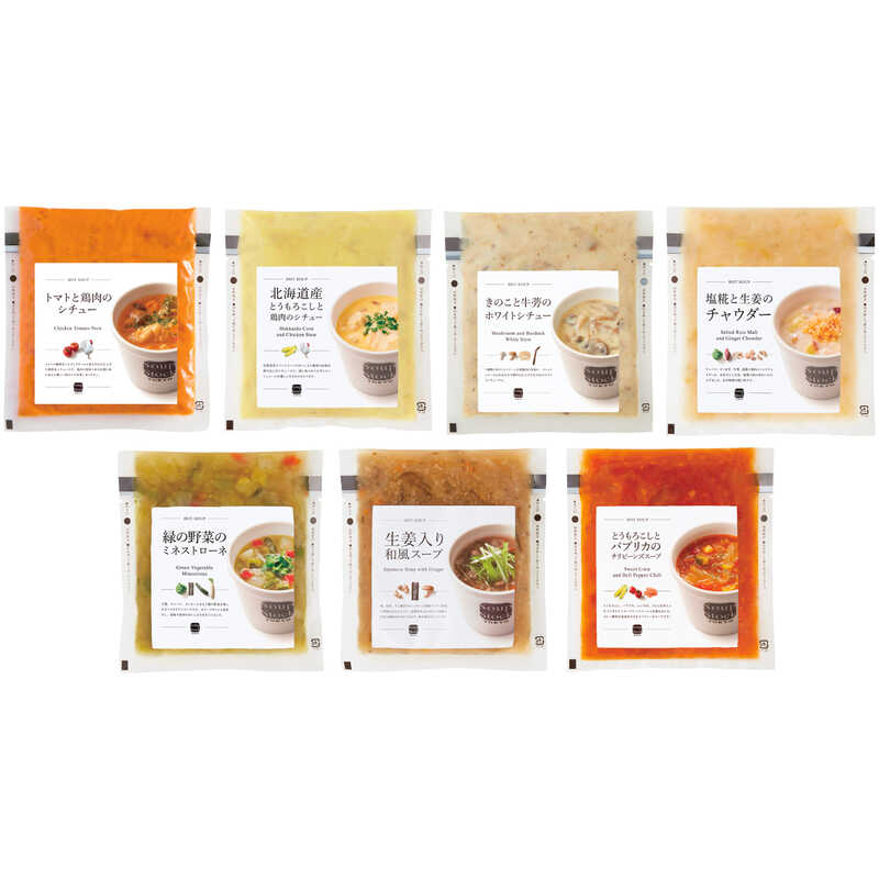 トマトと鶏肉のシチュー・北海道産とうもろこしと鶏肉のシチュー・きのこと牛蒡のホワイトシチュー・塩糀と生姜のチャウダー・緑の野菜のミネストローネ・生姜入り和風スープ・とうもろこしとパプリカのチリビーンズスープ(各180g)×各1(計7種7パック)
