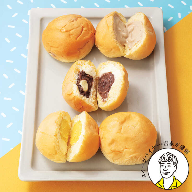 頬張るとふんわりしっとり、とろける食感。人気のくりーむパンの中から、定番のカスタードやチョコレート、季節限定のマロンやあんバター、今年新登場のおいも&カスタードの5種をセット。