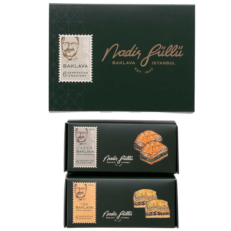 極薄パイ生地にナッツを挟んで焼きあげ、シロップ漬けにしたトルコの伝統スイーツ。ピスタチオとクルミの定番2種入りと、定番の味にチョコピスタチオ、ヘーゼルナッツを加えた4種入りをご用意。