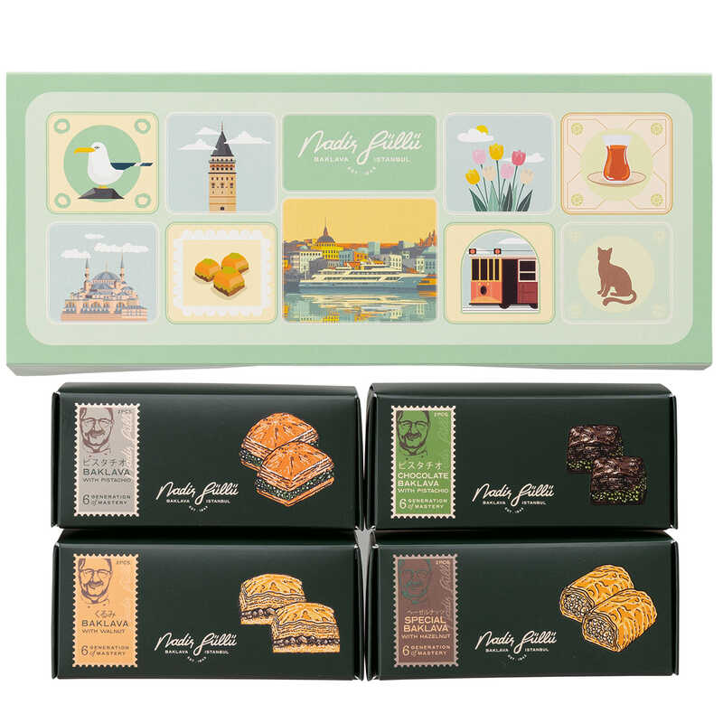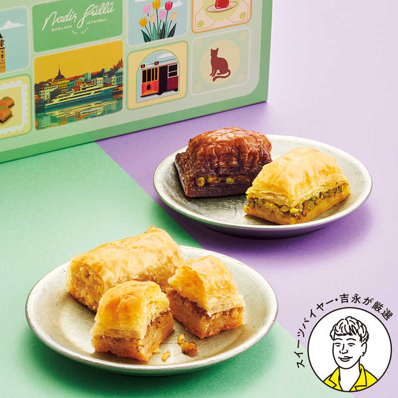 極薄パイ生地にナッツを挟んで焼きあげ、シロップ漬けにしたトルコの伝統スイーツ。ピスタチオとクルミの定番2種入りと、定番の味にチョコピスタチオ、ヘーゼルナッツを加えた4種入りをご用意。