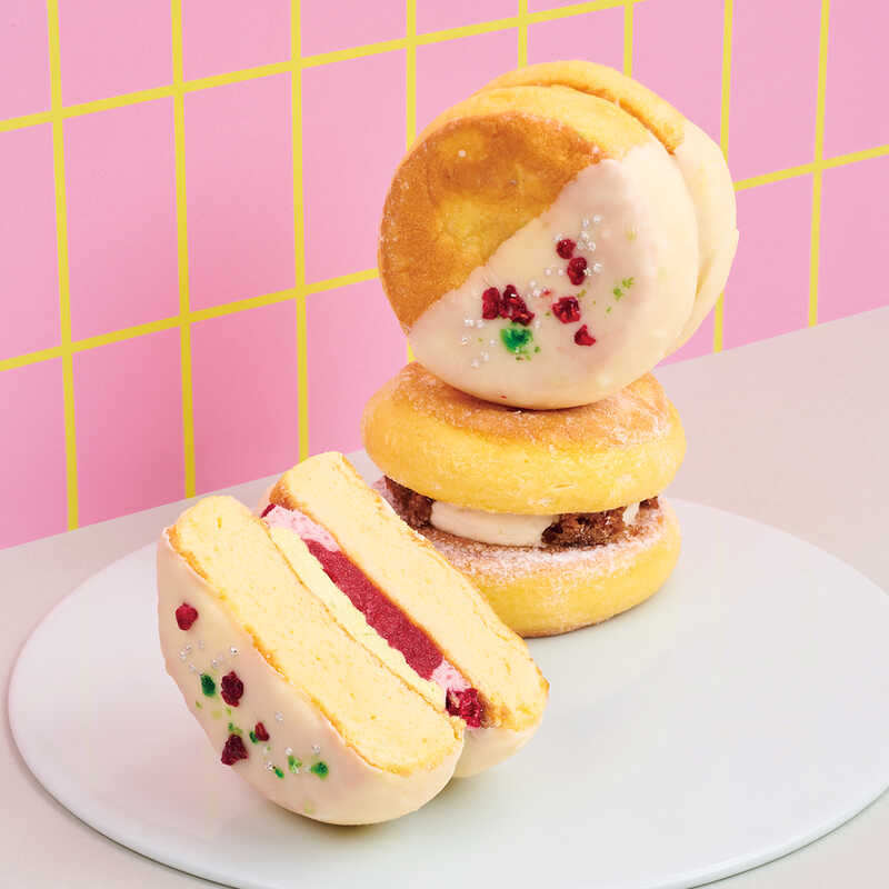 自家製のピスタチオクリーム、いちごとラズベリーのコンポート、クランチチョコを加えた「ストロベリーピスタチオ」は冬だけのテイスト。コクのある生クリームを挟んだ人気商品もセットしました。