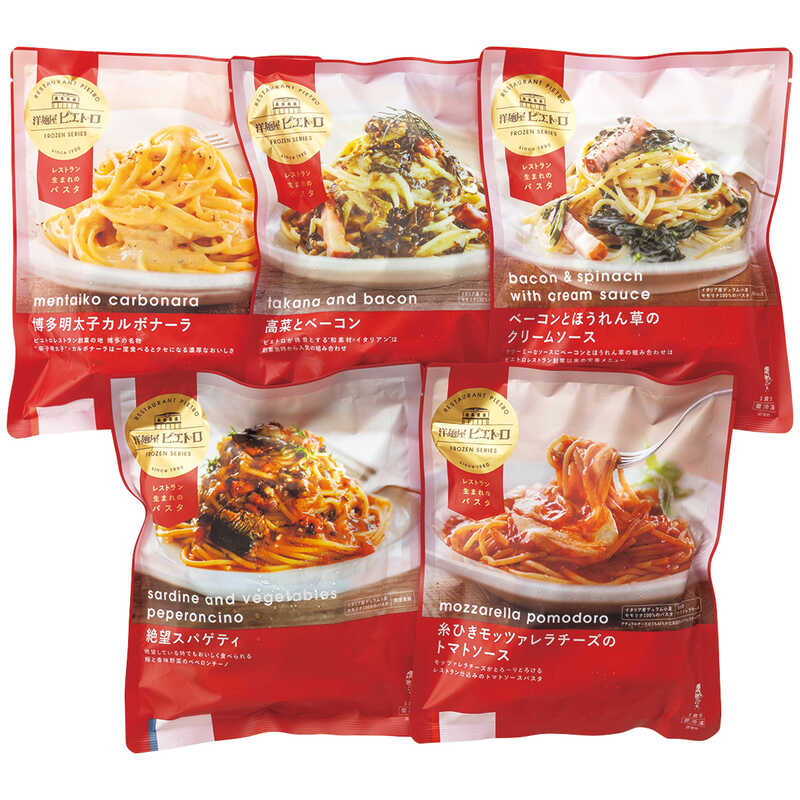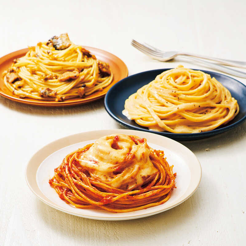 モッツァレラチーズが絶妙なトマトソースや、いわしと香味野菜のペペロンチーノなど、レストランの味をご家庭でも。