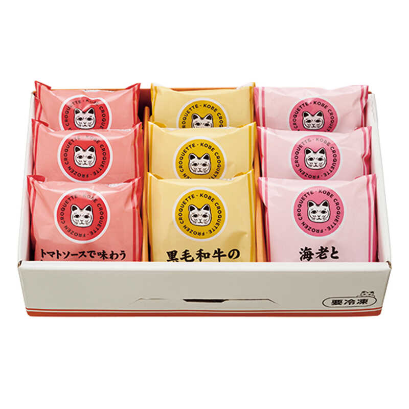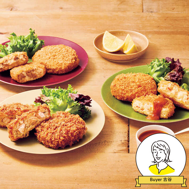- 黒毛和牛のビーフコロッケ(60g)・海老と帆立のカツ(70g)・トマトソースで味わう 蟹クリームコロッケ(コロッケ70g+ソース23g)×各3