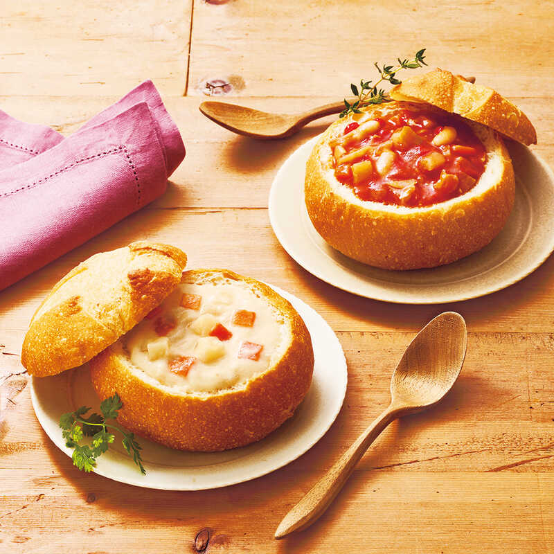 小麦の芳醇な香りをまとったブレッドボウルと、素材のうまみが溶け込んだ2種類の濃厚スープが奏でる、至福の味わいをお楽しみください。