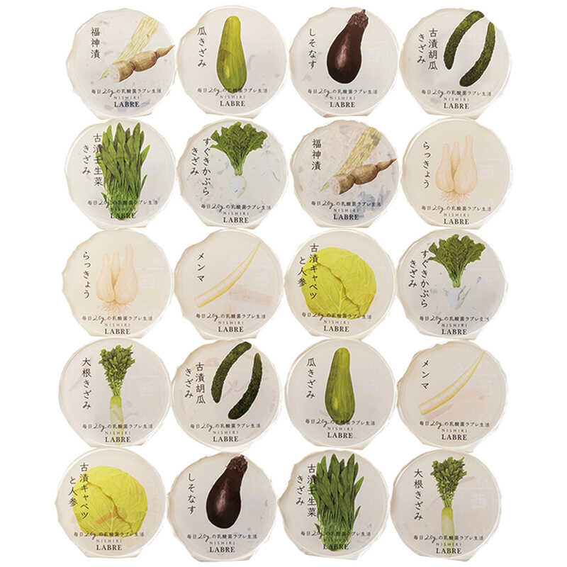 - 乳酸菌ラブレ(古漬胡瓜きざみ・大根きざみ・瓜きざみ・古漬キャベツと人参・しそなす・古漬壬生菜きざみ・らっきょう・福神漬・すぐきかぶらきざみ・メンマ(各20g)×各2)