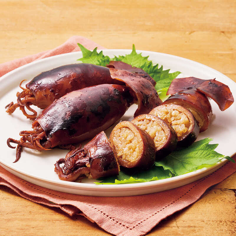 北海道産のいかを、げそまで丸ごと使った郷土料理。ブランド米「ゆめぴりか」ともち米を詰め、昔ながらの味付けでふっくらと炊きあげました。