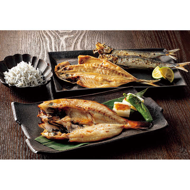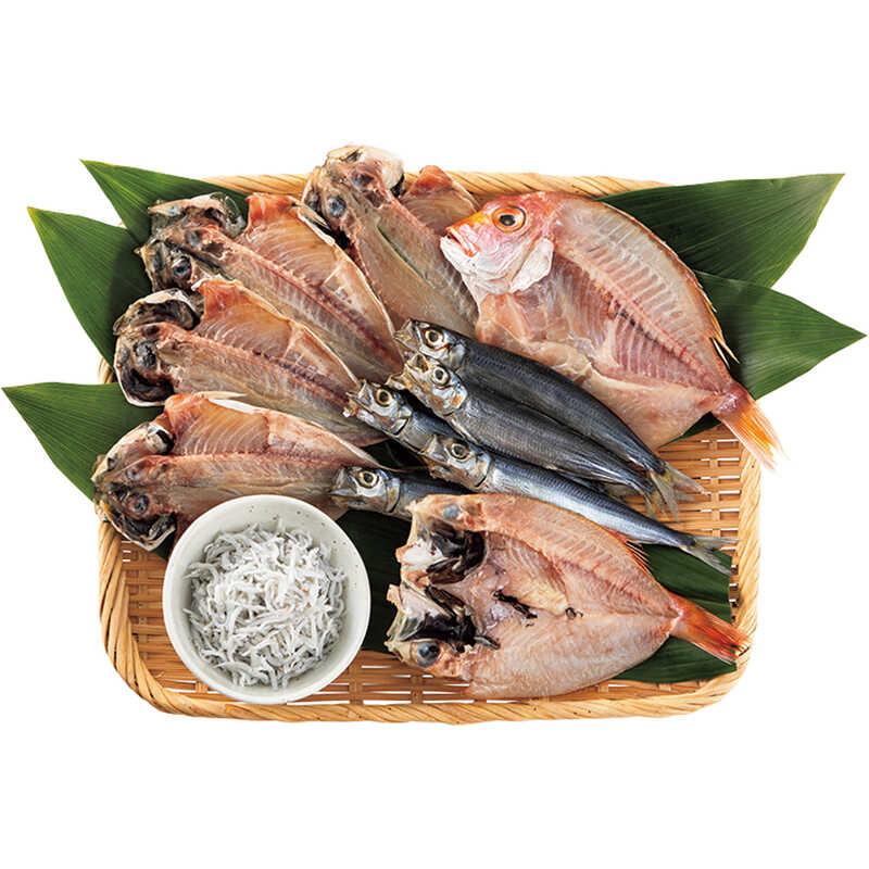 あじ開き(4枚)、連子鯛開き(1枚)、のどぐろ開き(1枚)、釜揚げちりめん(60g)、うるめ丸干し(5尾)