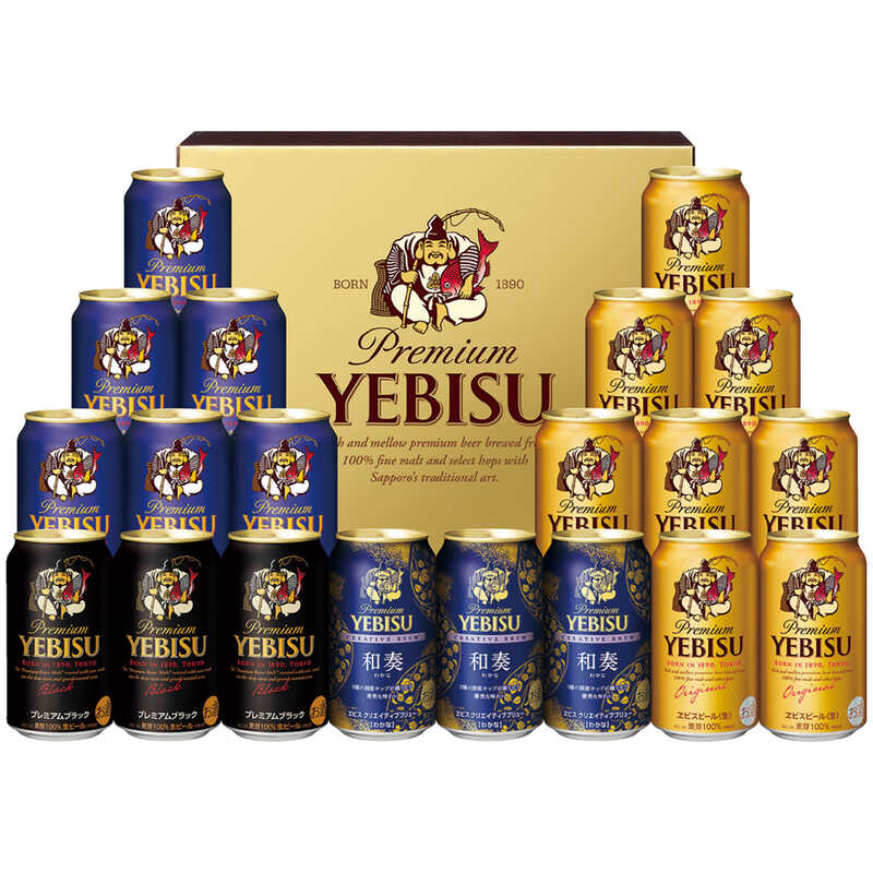- ヱビスビール×8・ヱビス クリエイティブブリュー和奏・ヱビス プレミアムブラック×各3・ヱビス プレミアムエール×6(各350mL)
