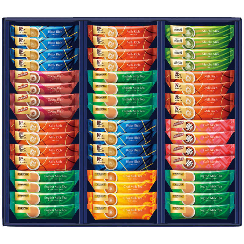 - 匠のカフェオレ/ミルクリッチ×12・ビターリッチ×8、辻利/抹茶ミルク×4、バンホーテン/ココアリッチ・カフェモカ×各4、トワイニング/イングリッシュミルクティー×12・チャイミルクティー×4