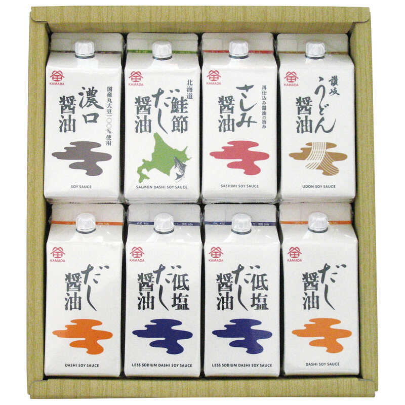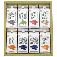 - だし醤油・低塩だし醤油×各2・濃口醤油・讃岐うどん醤油・さしみ醤油・北海道鮭節だし醤油×各1(各200mL)