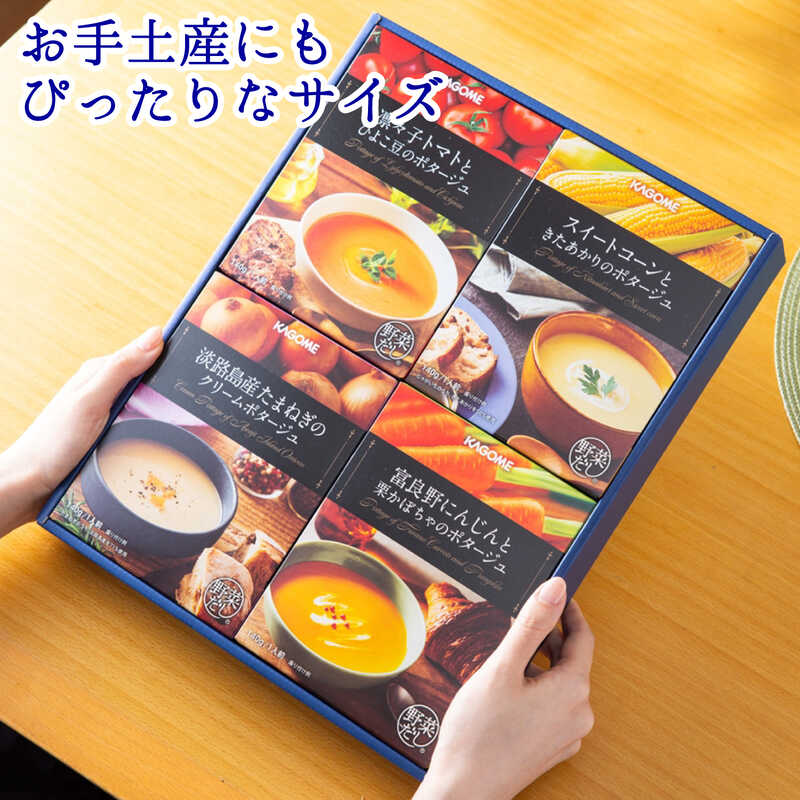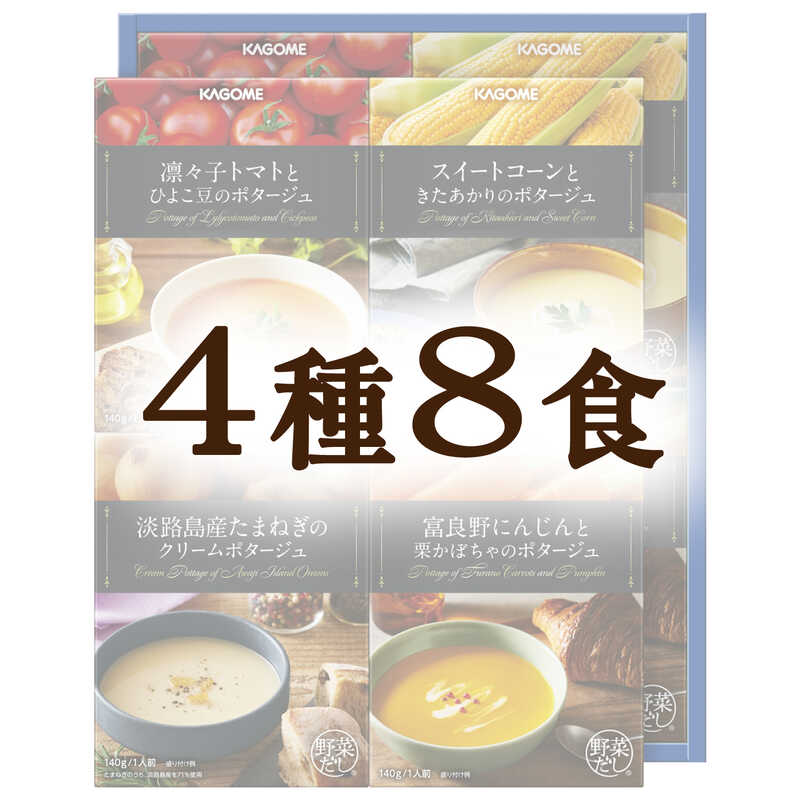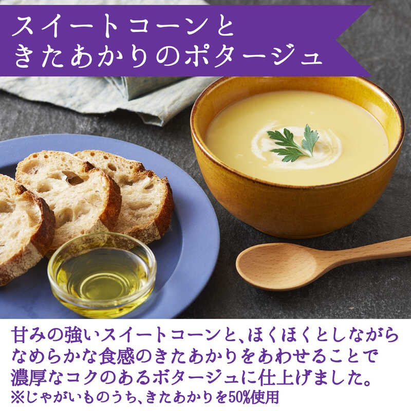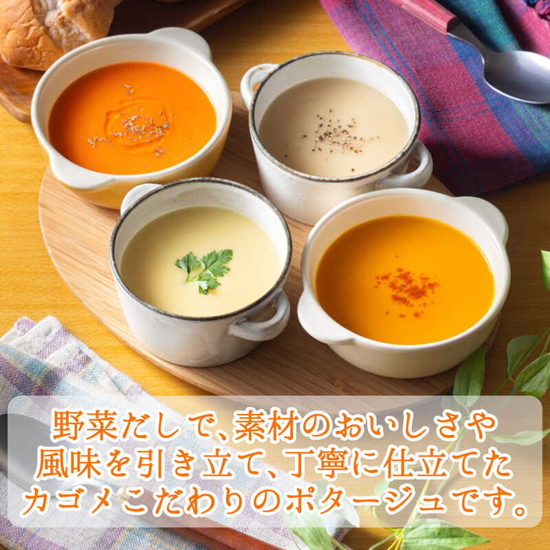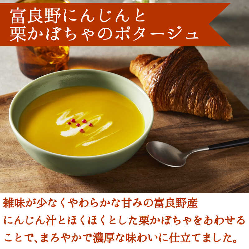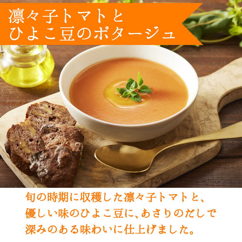- 凛々子トマトとひよこ豆のポタージュ・スイートコーンときたあかりのポタージュ・淡路島産たまねぎのクリームポタージュ・富良野にんじんと栗かぼちゃのポタージュ×各2(各140g)