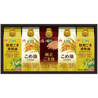 - こめ油(350g)×2、純正ごま油×1・焙煎ごま香味油×2(各300g)