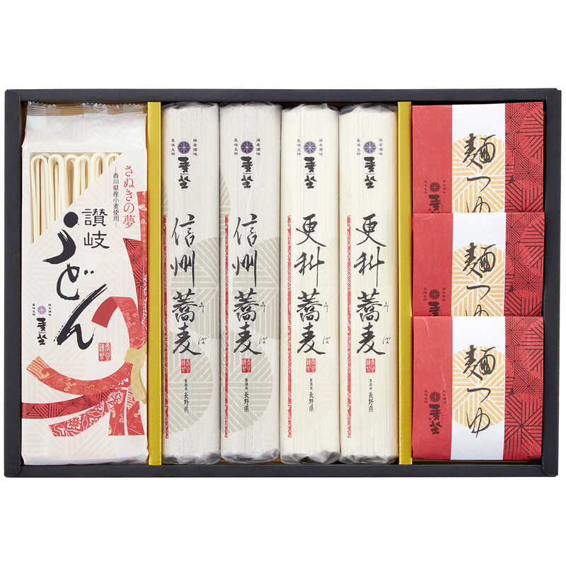 - 信州そば・信州更科そば×各2(各160g)、国産小麦使用讃岐うどん(170g)×1、鰹めんつゆ(30g×2)×3