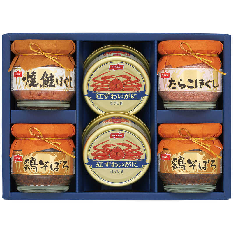 - 紅ずわいがにほぐし身(55g)×2、焼鮭ほぐし・たらこほぐし×各1・鶏そぼろ×2(各50g)