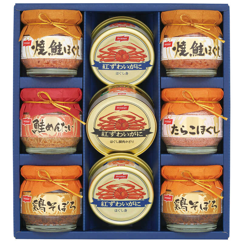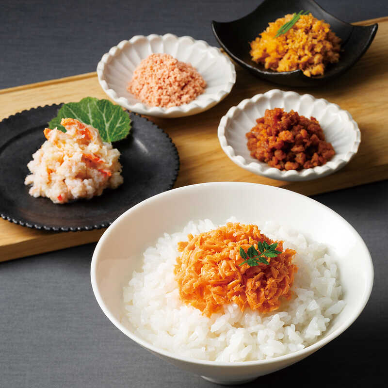 - 紅ずわいがにほぐし脚肉飾り(50g)×1、紅ずわいがにほぐし身(55g)×2、焼鮭ほぐし・鶏そぼろ×各2・たらこほぐし・鮭めんたい×各1(各50g)