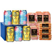 - ザ プレミアム モルツ・香るエール×各3(各350mL)、山桜燻製ボロニアソーセージ(スライス)・ロースハム(スライス)×各2(計80g)、燻製荒びきポーク×3(計135g)