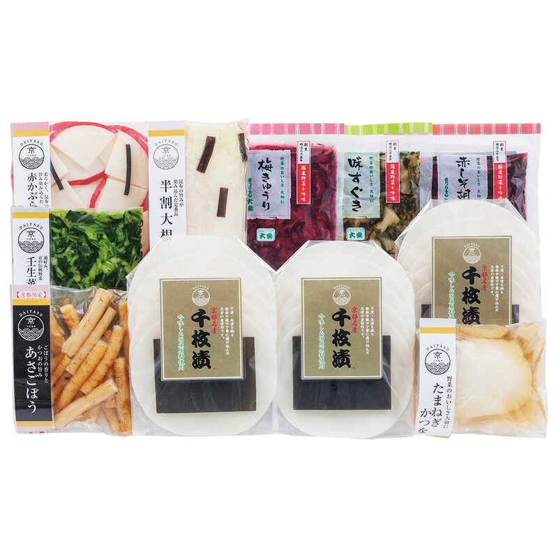 - 千枚漬(70g)×3、赤かぶら切漬(62g)・たまねぎかつを(1/2個)・半割大根(1/2本)・あさごぼう(90g)・壬生菜漬・味すぐき・梅きゅうり・赤しそ胡瓜(各40g)×各1