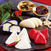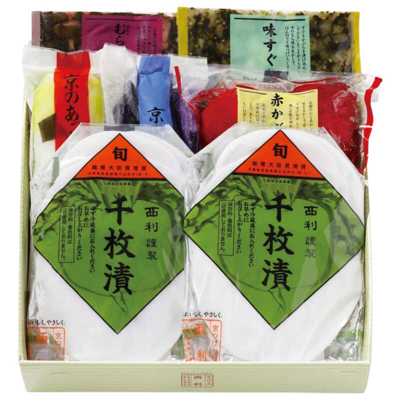 - 千枚漬(70g)×2、大根あっさり漬(1/4割)・茄子あっさり漬(1個)・赤かぶら(80g)・赤しそむらさきの(50g)・味すぐき(40g)×各1