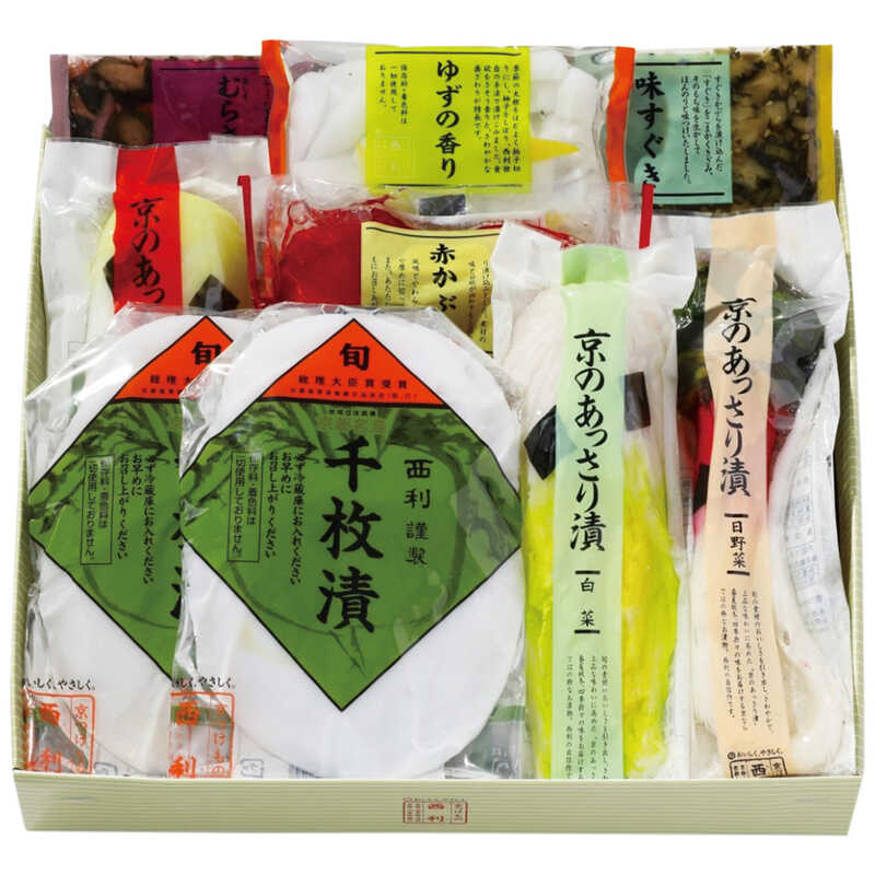 - 千枚漬(70g)×2、大根あっさり漬(1/4割)・白菜あっさり漬(223g)・日野菜あっさり漬(1本)・赤かぶら(80g)・赤しそむらさきの・ゆずの香り(各50g)・味すぐき(40g)×各1