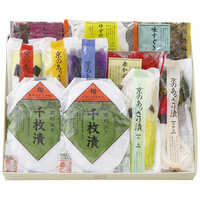 - 千枚漬(70g)×2、大根あっさり漬・大根柚子あっさり漬(各1/4割)・白菜あっさり漬(223g)・茄子あっさり漬(1個)・日野菜あっさり漬(1本)・赤かぶら(80g)・赤しそむらさきの・ゆずの香り(各50g)・味すぐき(40g)×各1