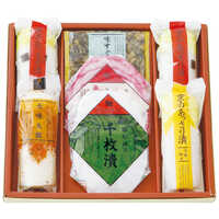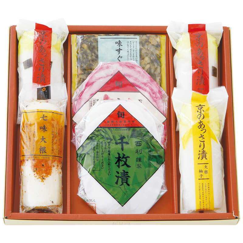 - 大根あっさり漬(1/4割)×2、千枚漬・かんながけ赤かぶら・味すぐき(各70g)・大根柚子あっさり漬・七味大根(各1/4割)×各1