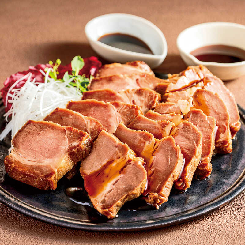 海外からの評価も高い東京・青山の中国料理店〈慈華〉の田村シェフが監修。香ばしくジューシーな焼き豚を、特製の醤油たれと黒酢たれで。
