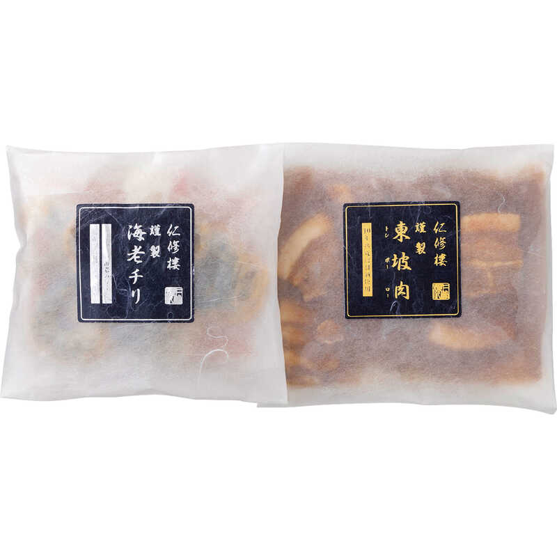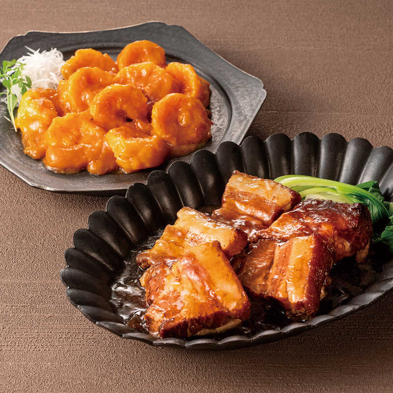 殻ごとローストして煮込んだえびチリは、まるでビスクのようにえびのうまみがたっぷり。約10時間かけて作る、とろける東坡肉(トンポーロー)とのセット。